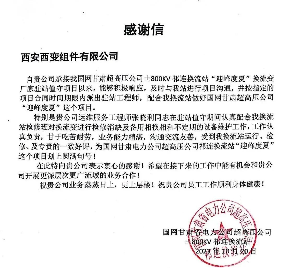 近日,西变组件收到来自国网甘肃省电力公司超高压公司±800kV祁连换流站发来的感谢信。